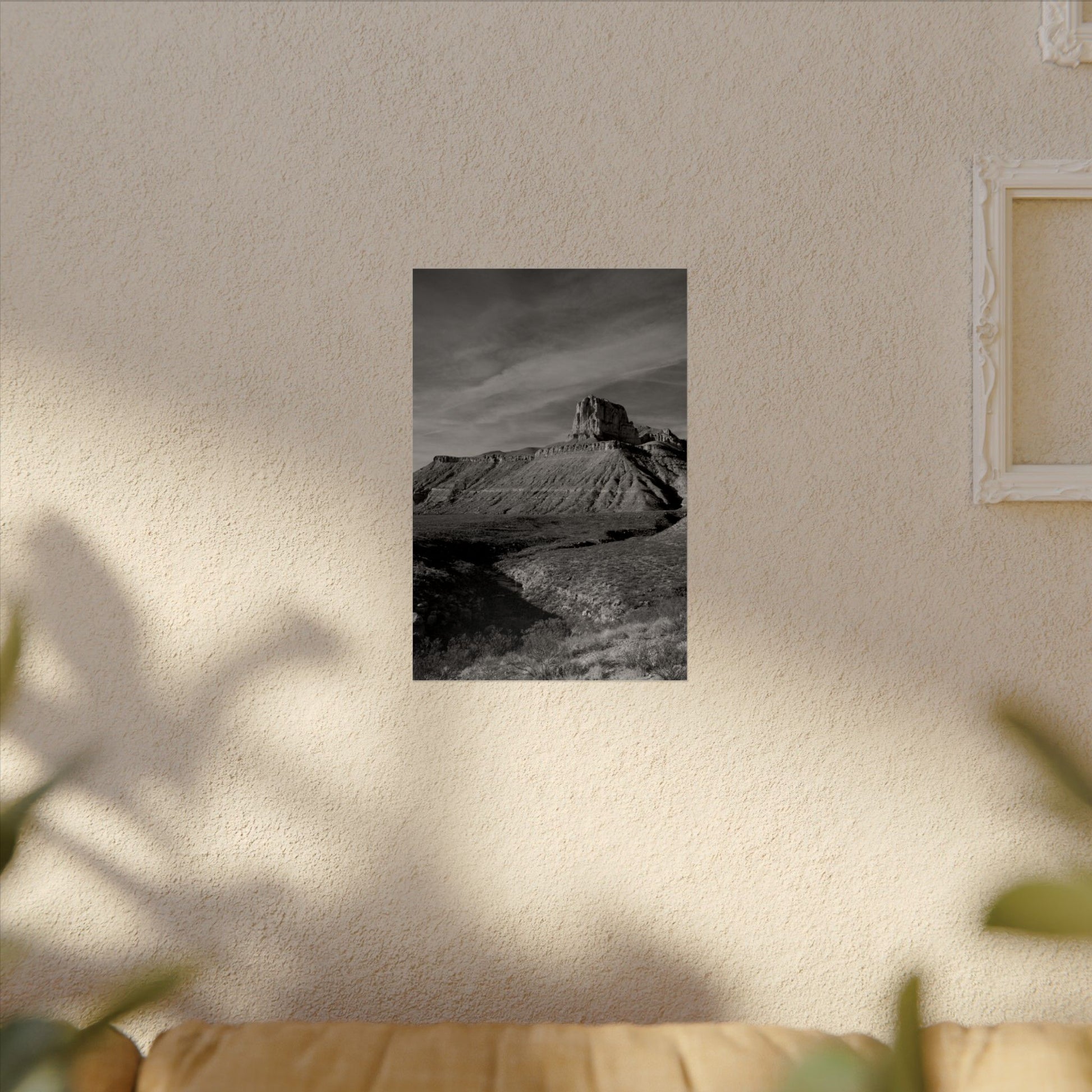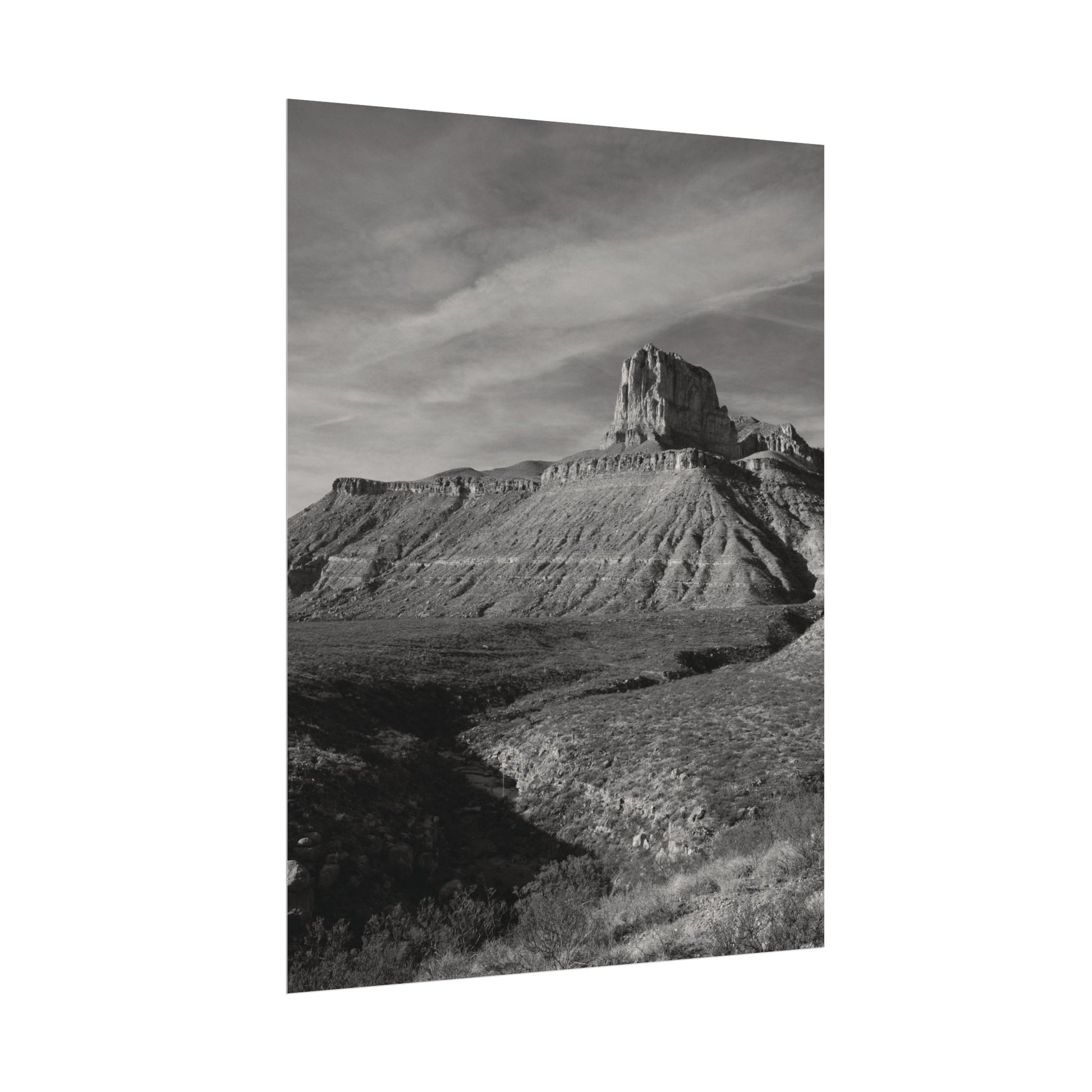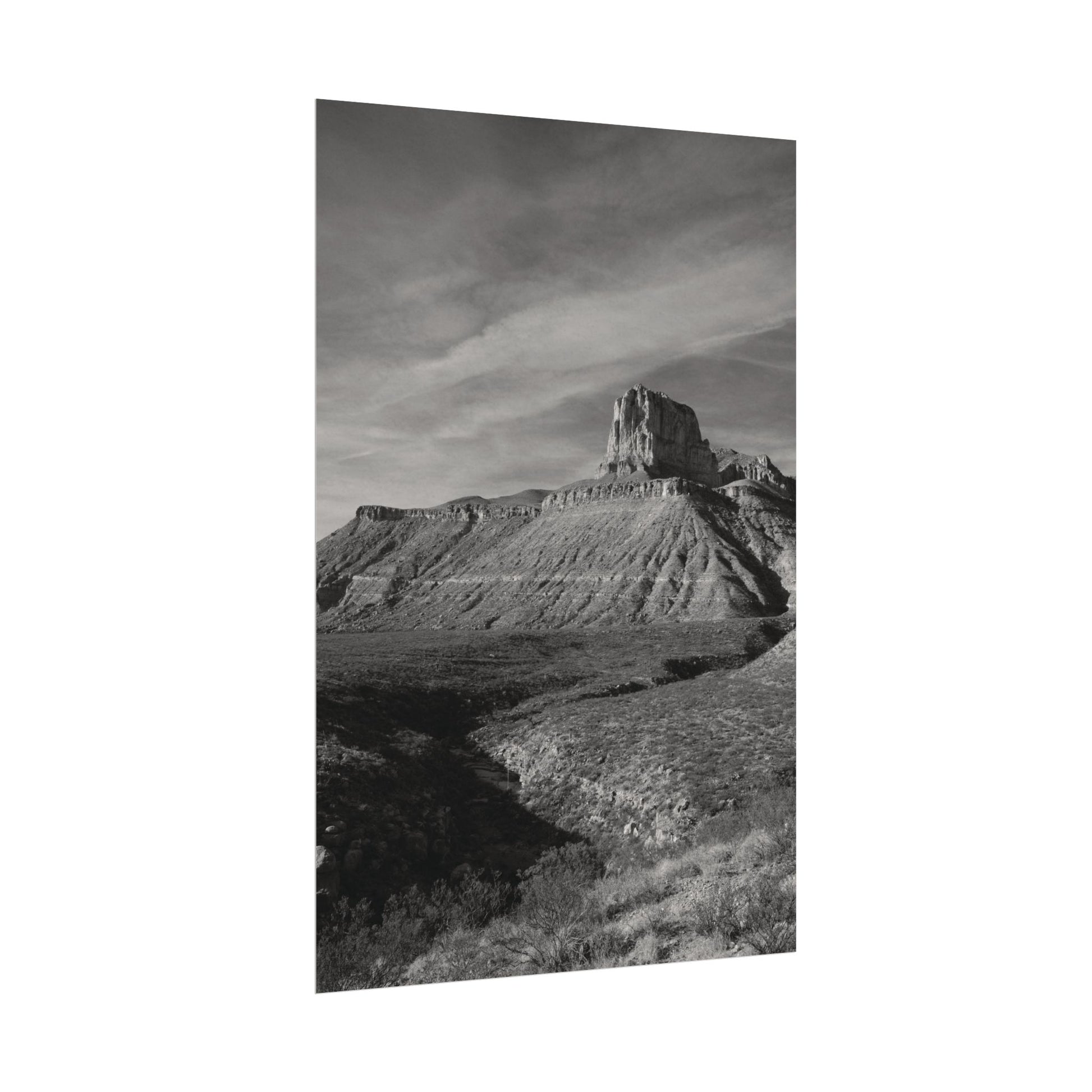 Guadalupe Peak towers over canyons and desert brush in black and white. Archival poster in 6 sizes. 2025.