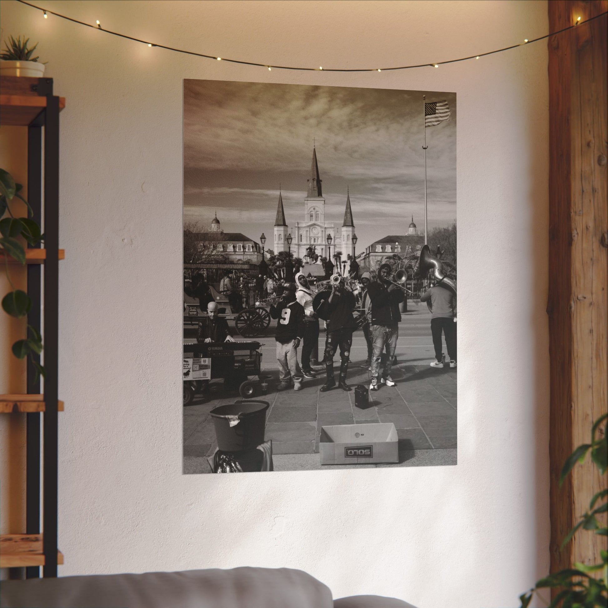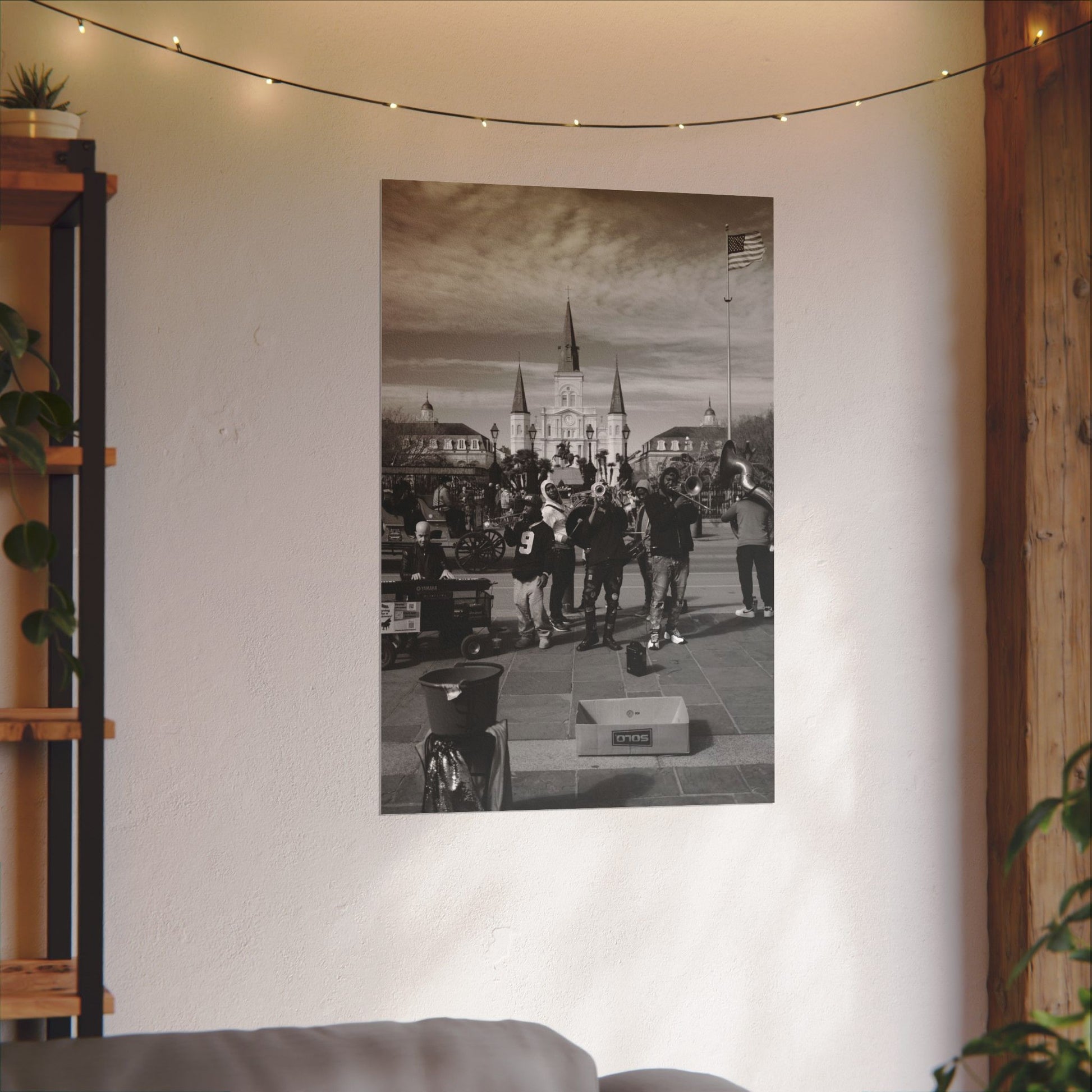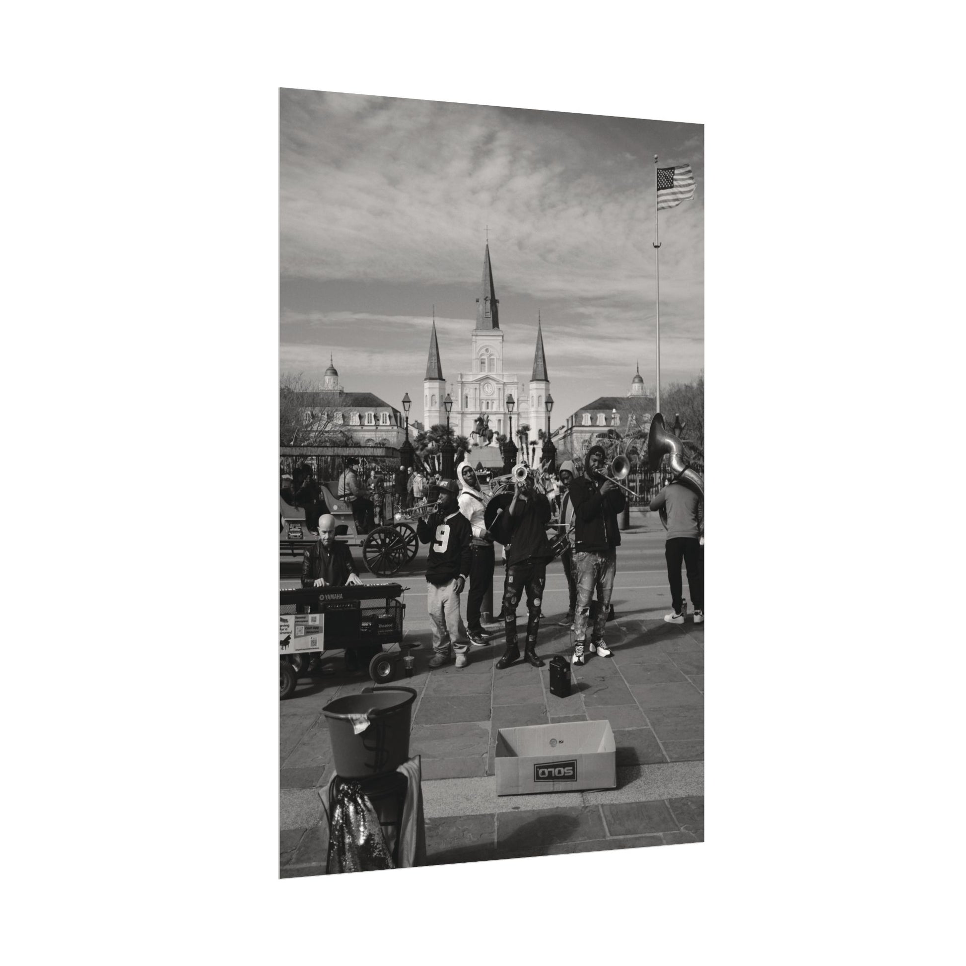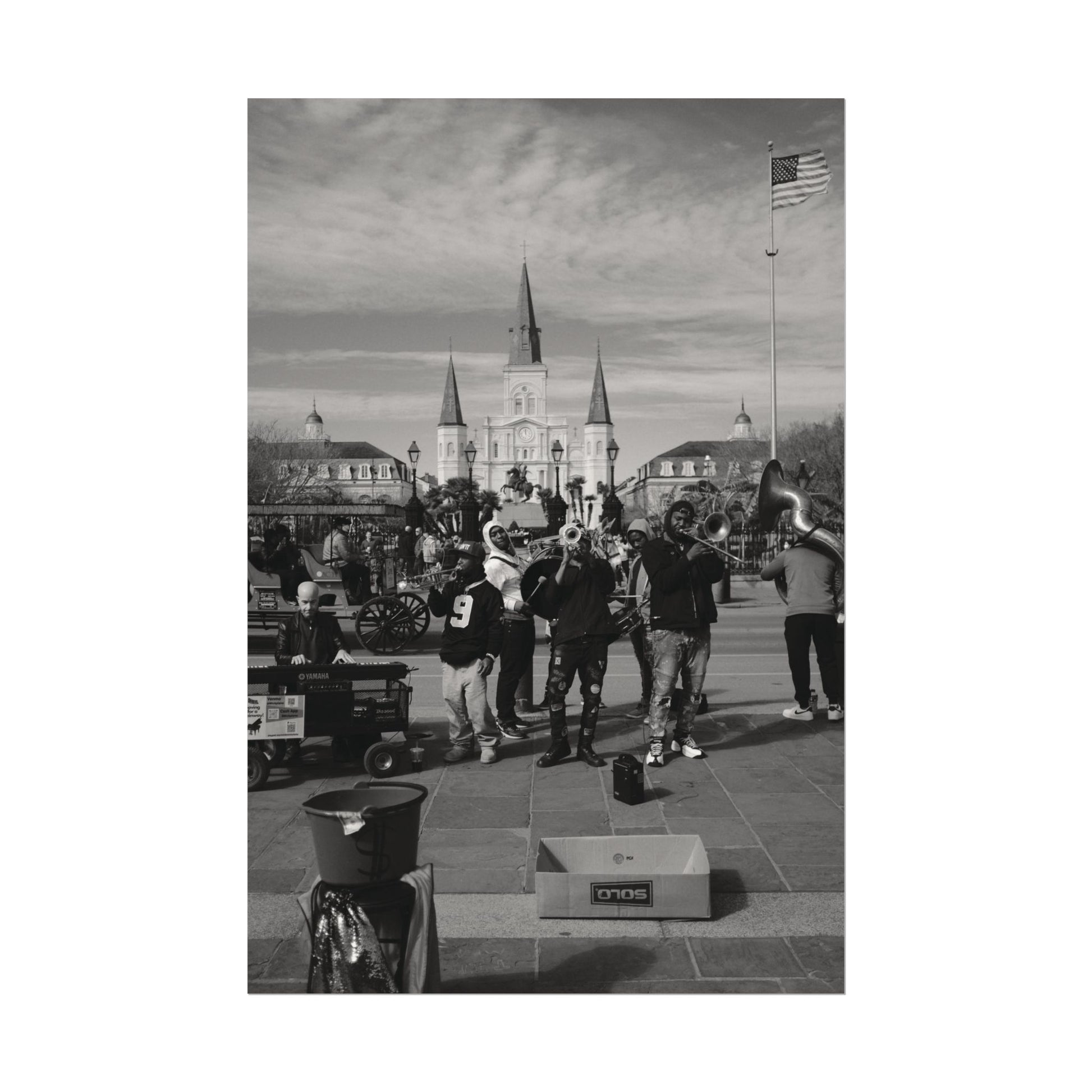 A brass band plays for tips outside historic Jackson Square in the French Quarter of New Orleans. Black and white. Archival poster in 6 sizes. 2020.