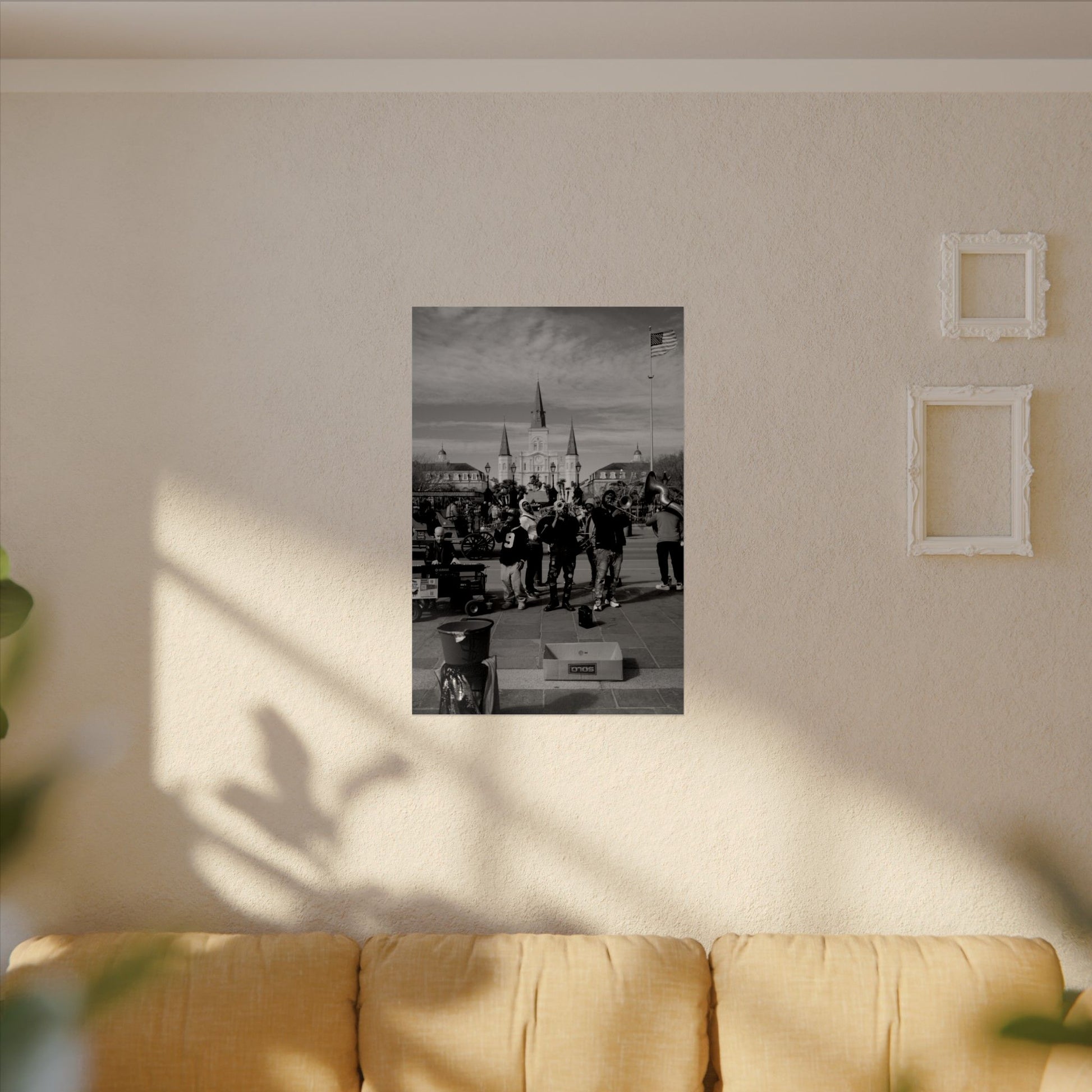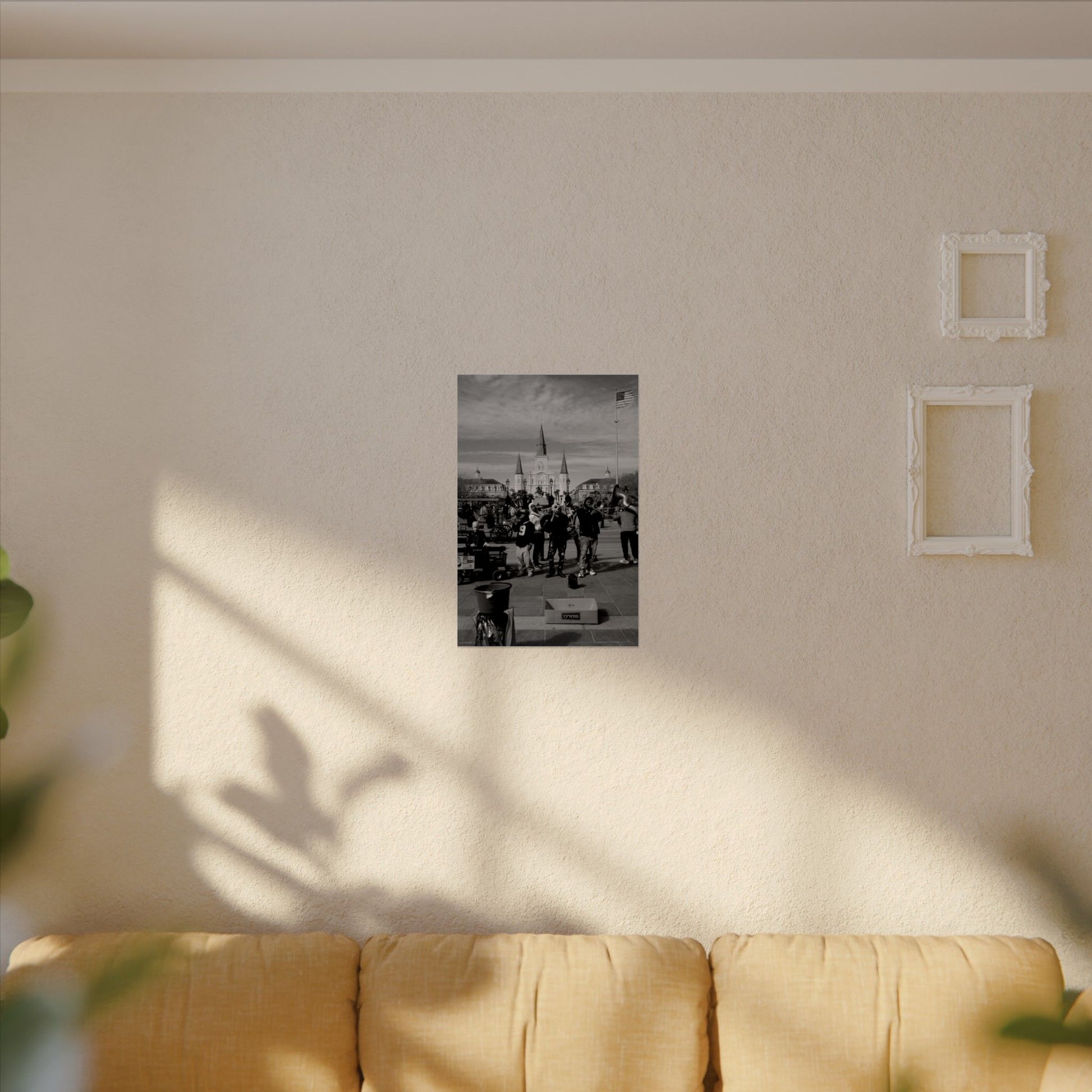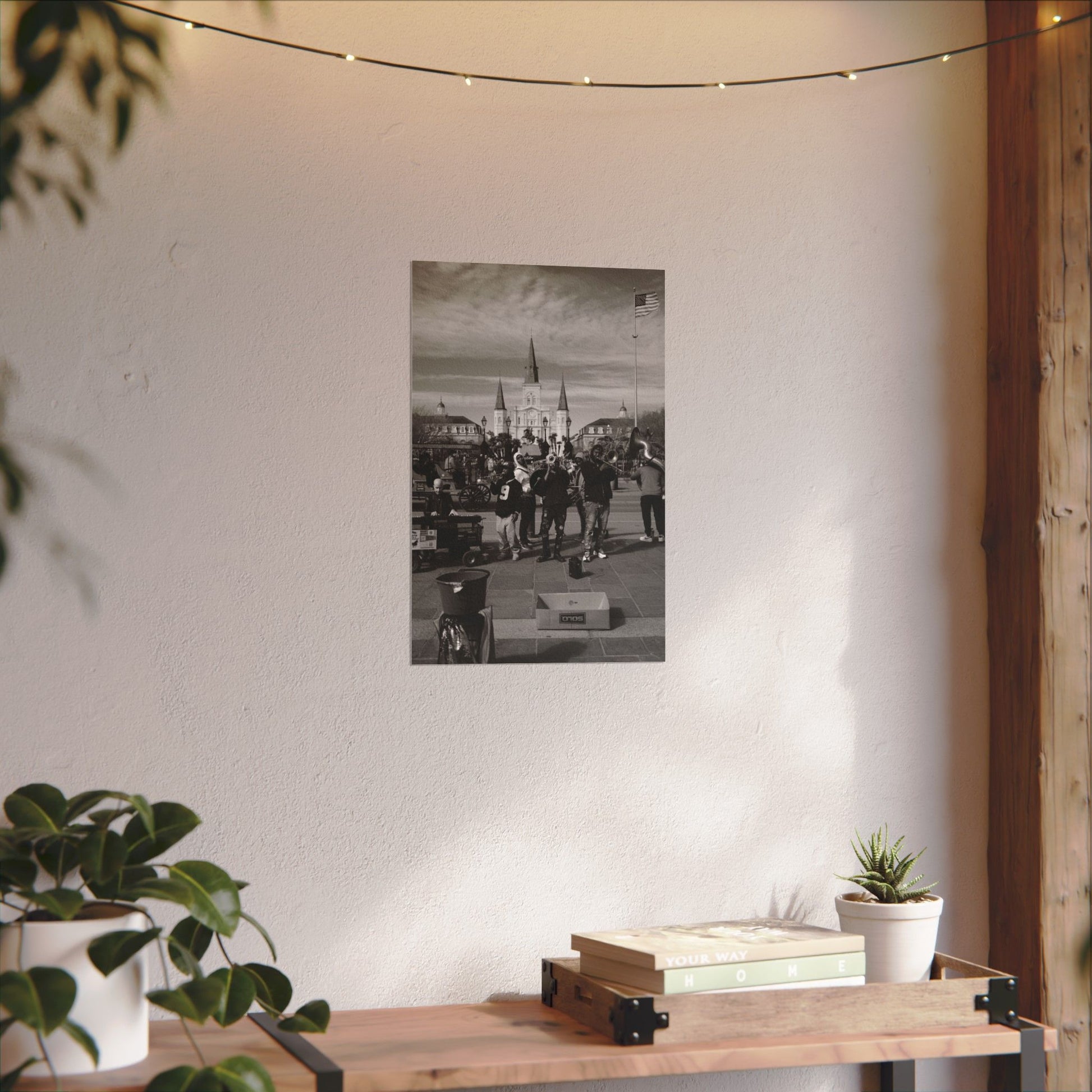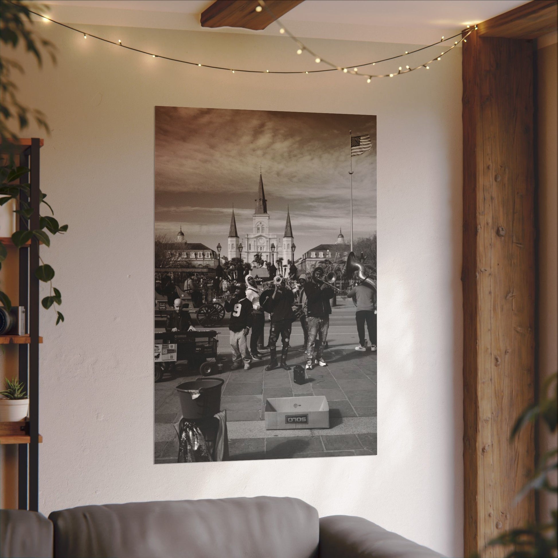 A brass band plays for tips outside historic Jackson Square in the French Quarter of New Orleans. Black and white. Archival poster in 6 sizes. 2020.