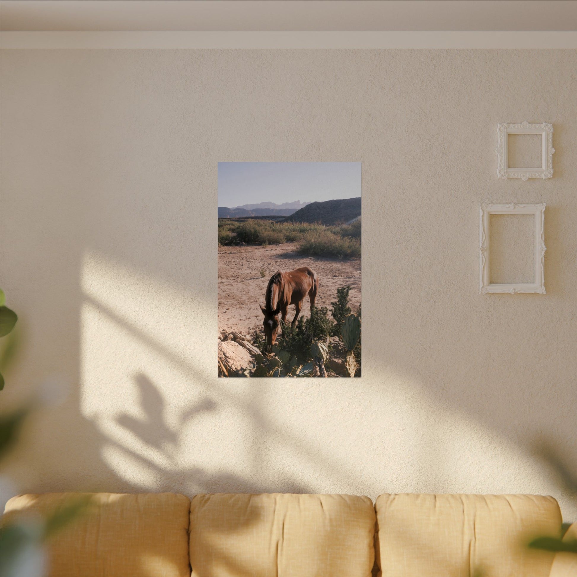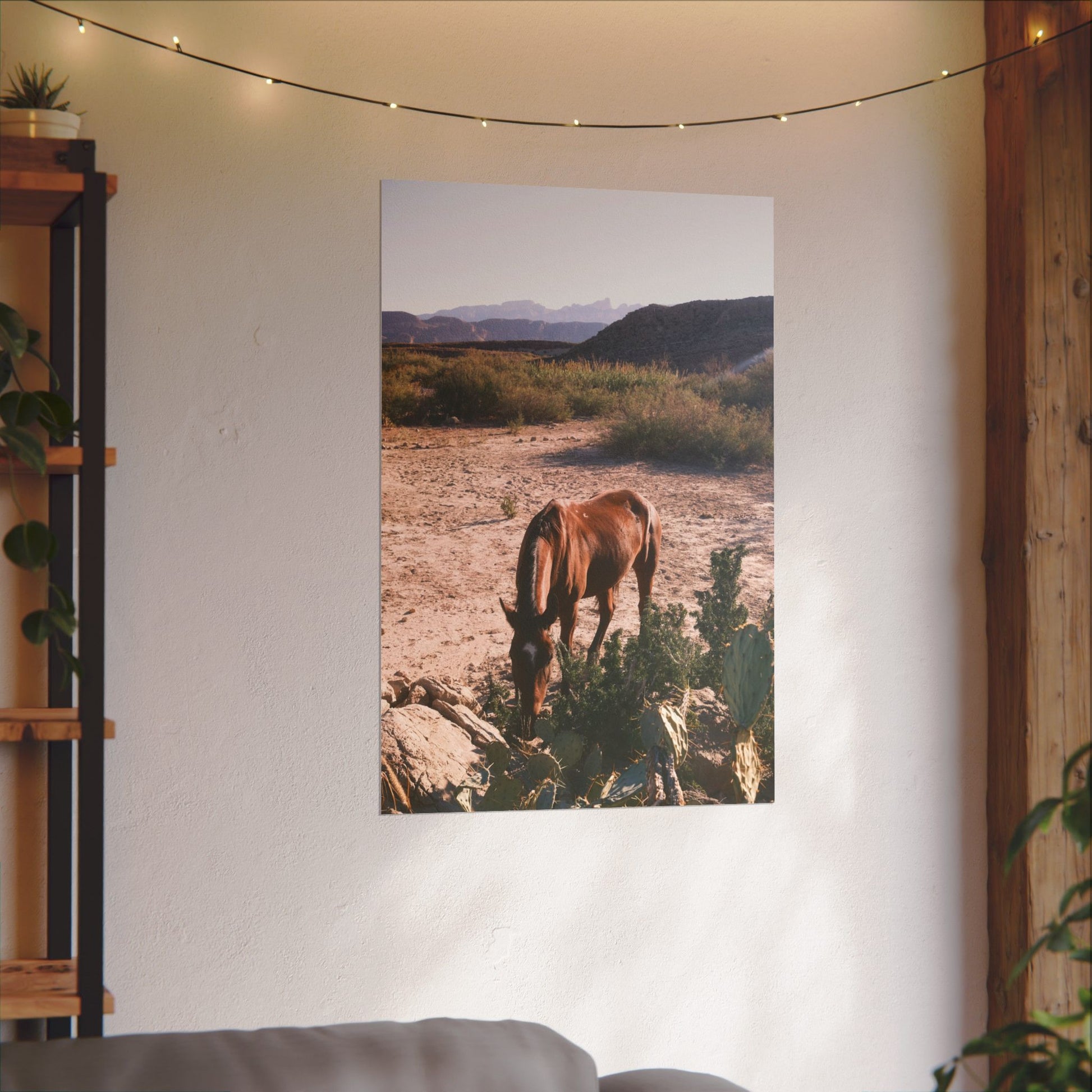 A wild horse grazes before the mountains in Big Bend National Park, TX. Archival poster in 6 sizes. 2025.