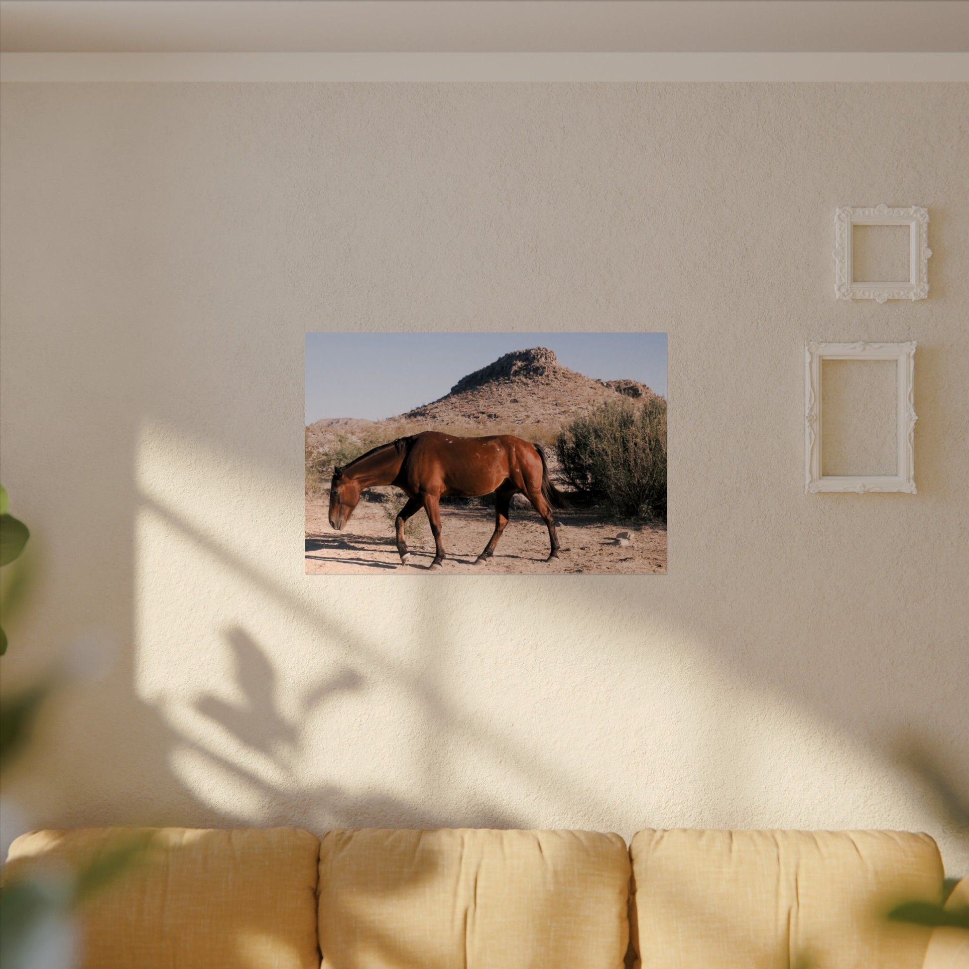 A beautiful wild horse grazes before the mountains. Big Bend National Park, TX. Archival poster in 6 sizes. 2025.
